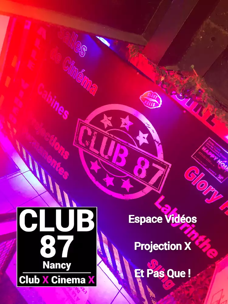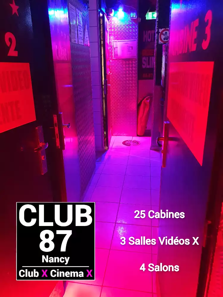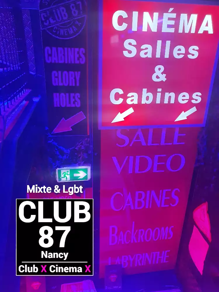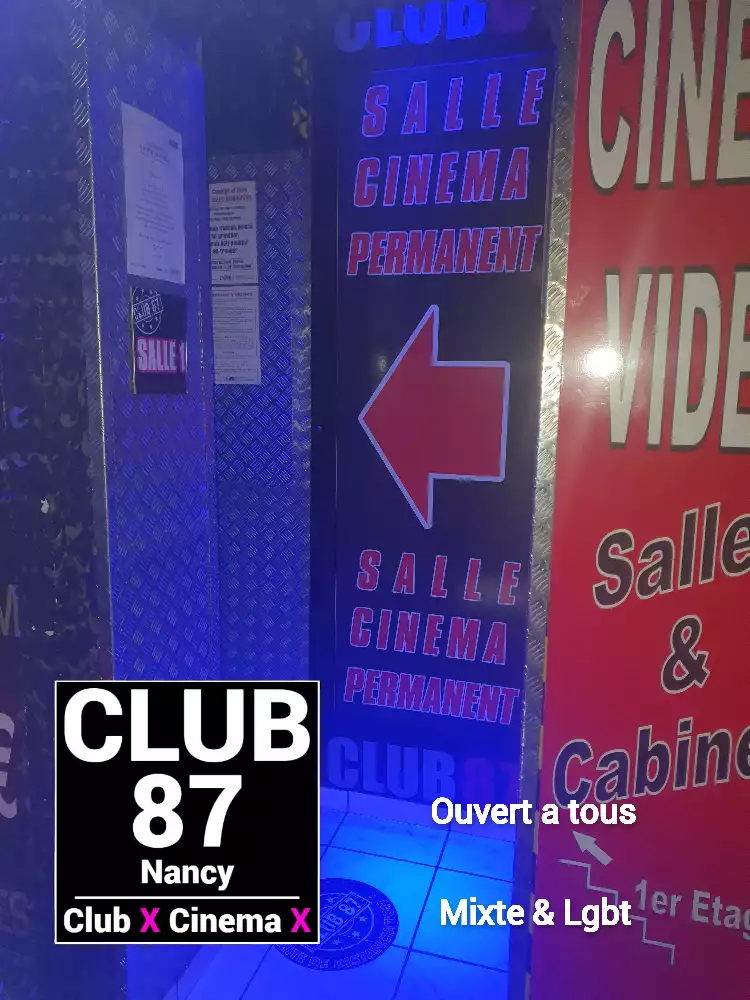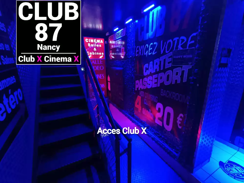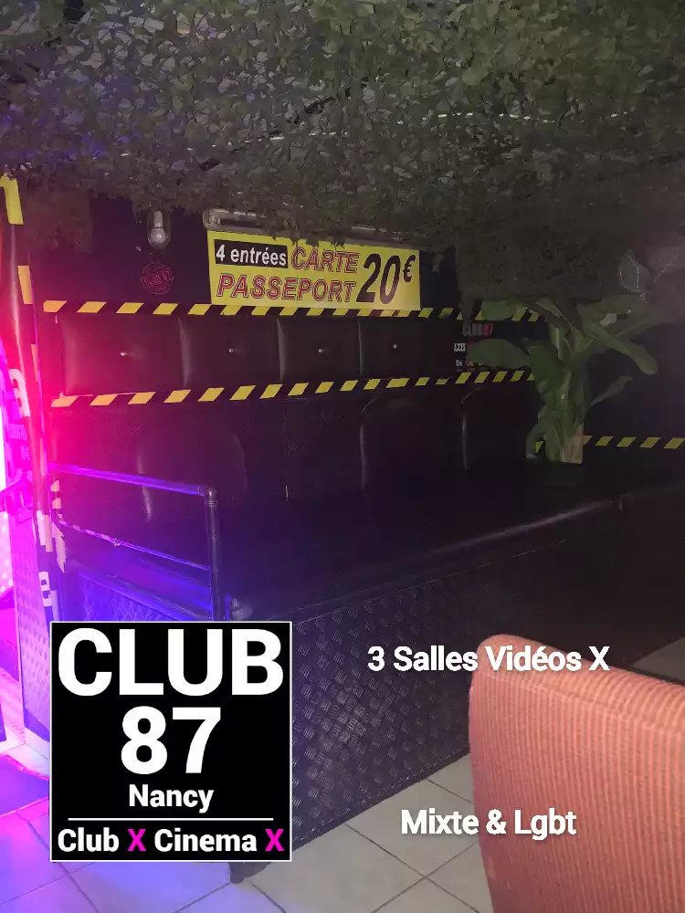 Le Club 87 Nancy - Club X - Cinema X libertin Un endroit, un club véritablement dédie aux partages des plaisirs, au cœur de Nancy Enfin un endroit où vous trouverez sans nul doute ce dont vous rêver À tous moments. Club 87 fait portes ouvertes A toutes vos ardeurs. Ouvert 7 jours sur 7, 10h à 20h non-stop. 400m2. Sur 3 niveaux - tout équiper, Cabines, Salles vidéo, Salons, Backroom, Labyrinthe, Croix St André, Glory Hole, Cage, Sling, Coins câlins. Totalement climatiser, machine boisson fraiche ou chaude. Casier avec cadenas, douche, coin fumeur. Mixte, couple, femme, homme seule, lgbt. Entrée 10 euros valable toute la journée.