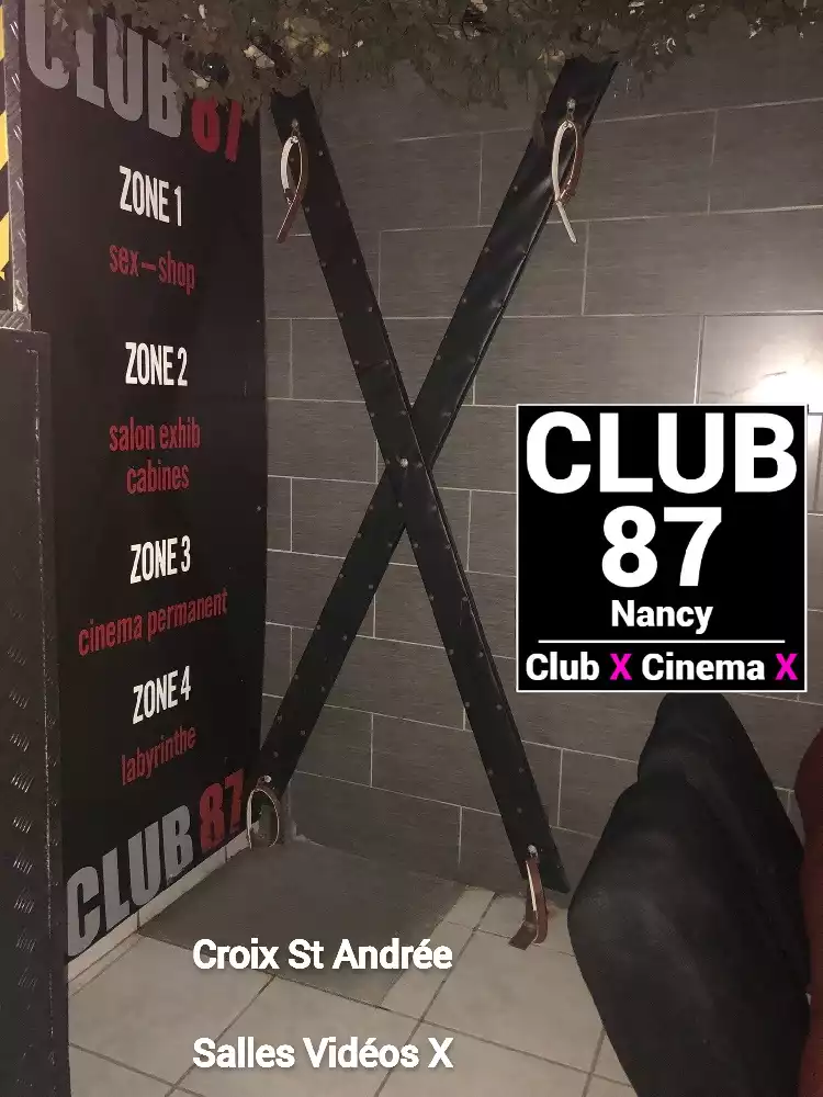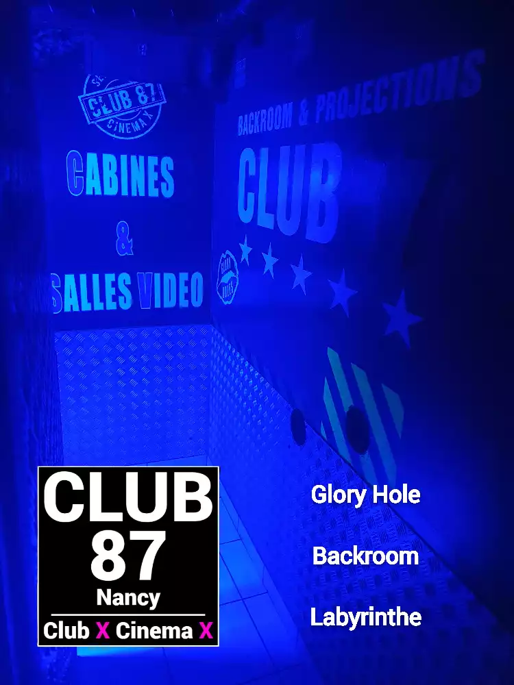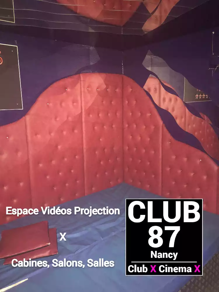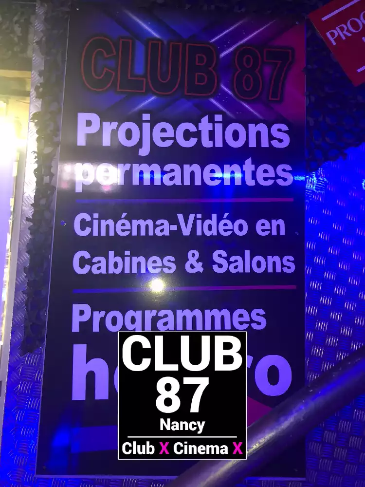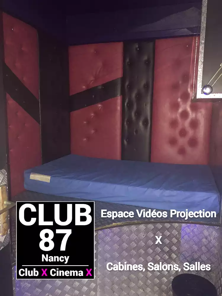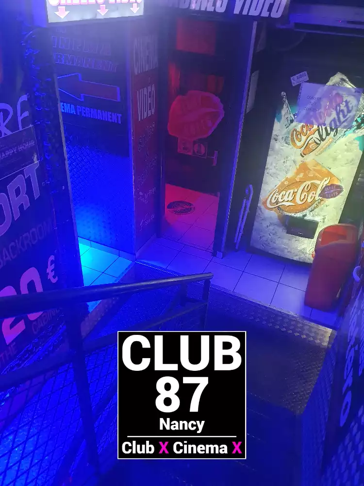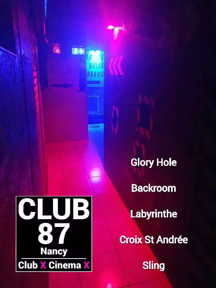 Le Club 87 Nancy - Club X - Cinema X libertin Un endroit, un club véritablement dédie aux partages des plaisirs, au cœur de Nancy Enfin un endroit où vous trouverez sans nul doute ce dont vous rêver À tous moments. Club 87 fait portes ouvertes A toutes vos ardeurs. Ouvert 7 jours sur 7, 10h à 20h non-stop. 400m2. Sur 3 niveaux - tout équiper, Cabines, Salles vidéo, Salons, Backroom, Labyrinthe, Croix St André, Glory Hole, Cage, Sling, Coins câlins. Totalement climatiser, machine boisson fraiche ou chaude. Casier avec cadenas, douche, coin fumeur. Mixte, couple, femme, homme seule, lgbt. Entrée 10 euros valable toute la journée.